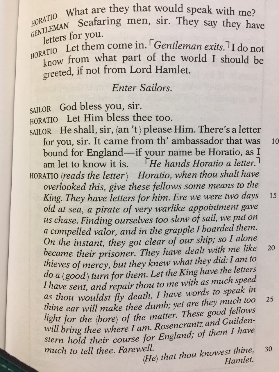 Inference: if “I see a cherub that sees [Claudius’ purpose]” (4.4.56) means that Hamlet has figured out that he’s being sent to his death— further supported by “There’s letters sealed; and my two schoolfellows, whom I trust as I will adders fanged,/…they must sweep my way/ and marshal me to knavery” (3.4.225-228)—and if Hamlet is resourceful enough to know a variety of rough characters, it would be quite convenient to arrange a pirate encounter that lasts only long enough for him to board the pirate ship and be “held hostage” and, thus, escape.